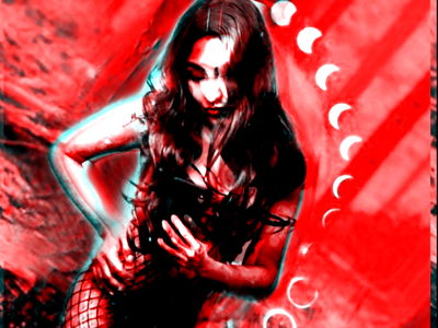 Anghellic is seen from behind, looking away. She is dressed in black lingerie and black fishnet stockings. The background is dark with subtle blue lighting. Her expression appears to be neutral, and she is posed slightly off-center.