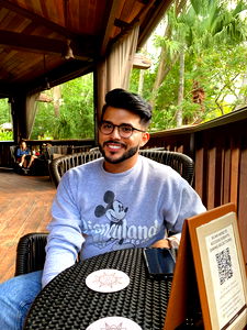 A young man with glasses is seated at an outdoor cafe table, leaning casually on it. He's wearing a casual t-shirt and is smiling at the camera. The background suggests a relaxed atmosphere, possibly during evening hours.