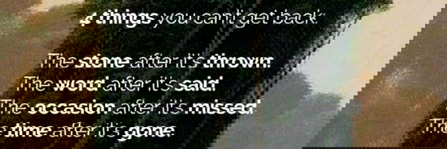 A motivational quote about the power of words and stone, attributed to Gillian from Virginia, USA. The text encourages taking action and making the most of time. It appears to be a screenshot of a social media post or graphic design.