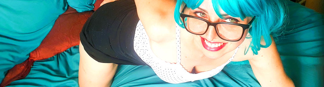 Anna Rocks is an Onlyfans model known for her unique style. She sports a vibrant turquoise wig paired with black glasses and a black and white lingerie set. Her photo exudes confidence and allure.
