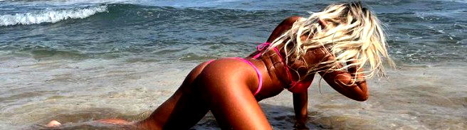 The OnlyFans model Annpearl is seen posing on a beach with her bikini. She's dressed in a vibrant pink bikini, which makes her stand out against the sandy backdrop.