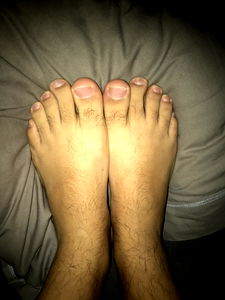 A view of the bottom of a person's foot with their toes curled up. It appears to be a man's foot, and the image is taken from an elevated perspective.