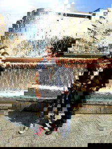 The image features two men standing close to each other in front of a city fountain. They are dressed casually, with one man wearing a hat and sunglasses, while the other is sporting a t-shirt with a graphic design. The setting appears to be an urban outdoor area, as suggested by the architectural elements in the background.
