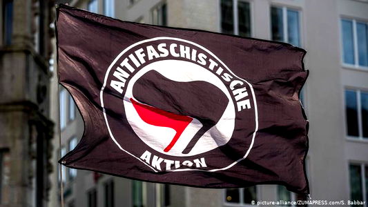 The flag features the AntiFaschist symbol, a wing and clenched fist, set against a black background with white text. This is likely a representation of a protest or movement against what they consider fascist ideology.