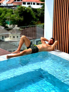 Antonio Mallorca, a model from Spain, strikes a pose for the camera in his underwear. The backdrop of a tropical beach adds to the relaxed and fun atmosphere. #BeachVibes #SpanishModel #FashionForward #TravelMode #SummerAesthetic