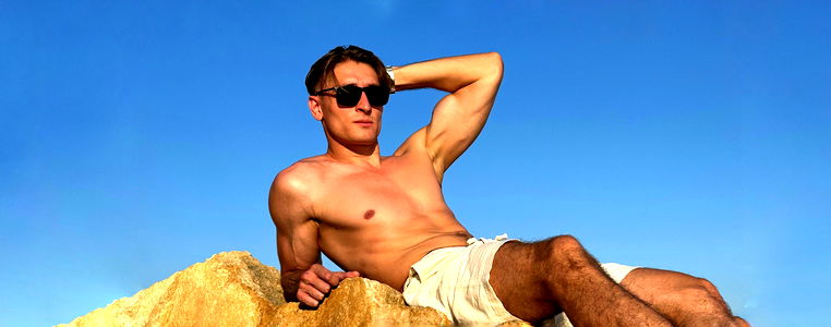 A young adult male fitness model. Photographed outdoors at the beach with clear blue skies. Wearing sunglasses and a tank top, he showcases his physique in a relaxed pose.