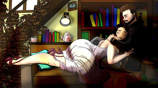 Anuray, a popular interactive model, is shown in this artwork. She is seated on a couch with an individual who appears to be her caretaker or a guest visiting the home.