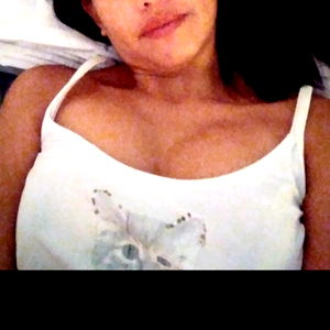 A young woman wearing a white tank top is reclined and looking at the camera with an expression of concern or contemplation.