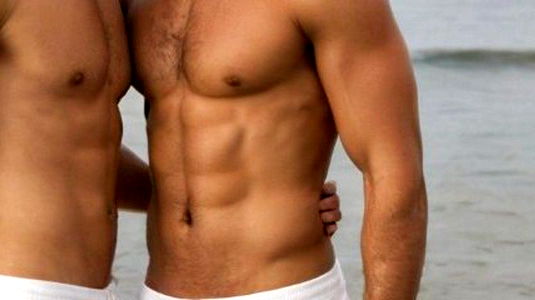 A photograph of a topless couple embracing and standing close together on a beach with clear skies, wearing swimwear, in front of the ocean.
