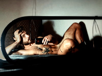 A young, tattooed man with a muscular build and a beard. He is shirtless in an indoor setting, leaning against a wall.