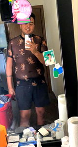 A behind-the-scenes look at a casual photoshoot of Milwaukee model Aram. Tropical patterned shirt paired with black shorts, standing against a wall with blue paper decoration. Onlyfans exclusive.