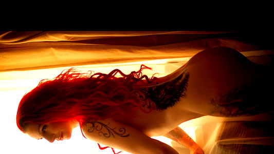 The image depicts a European model with striking red hair and elaborate tattoos. She is posing seductively on top of a bed, her body turned towards the camera with one leg casually propped up, creating an intimate atmosphere. Her attire consists of lingerie, which contrasts with the light-colored sheets below her. The overall composition suggests a professional and sophisticated photoshoot.