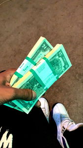 A hand holding a set of US 20 dollar bills. The bills are new, with serial numbers clearly visible on the first bill. The background is indistinct but appears to be an indoor space. OnlyFans model ThumbHefner is present, as indicated by the username in the image.