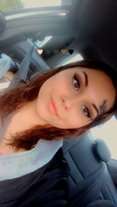The image features a young woman, who is striking a pose inside a vehicle. She has a playful smile and is dressed in casual attire with a pop of color from her eyeshadow. The blurred background suggests an urban environment.