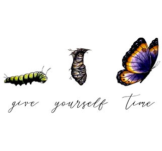 Featuring Baaby, a model from Las Vegas, Nevada, this image presents a collection of butterfly and caterpillar images that showcase the transformation journey. The phrase 'Give yourself time' is also present in the image, suggesting a theme of growth and personal progress.