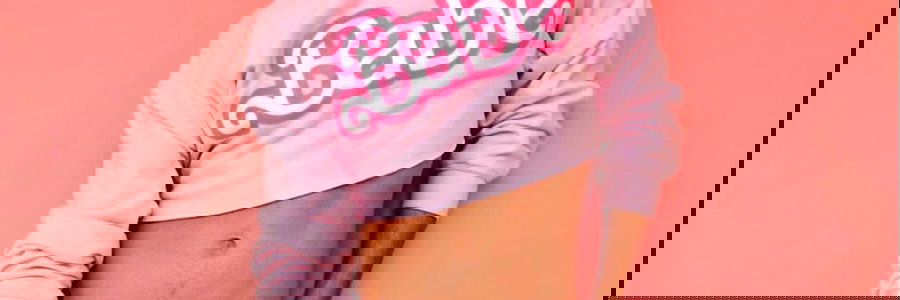 Basti, an Onlyfans model, confidently showcases a pink sweatshirt with the word 'BAE' on it against a pastel pink background. Modeling a casual yet fashionable look.