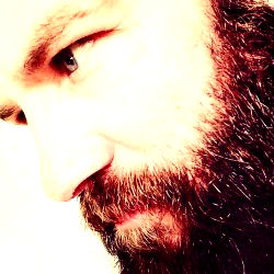 The image is of a bearded man with chest hair. He has tattoos on his right arm and a visible nipple piercing. The background is neutral and out of focus, emphasizing the subject.