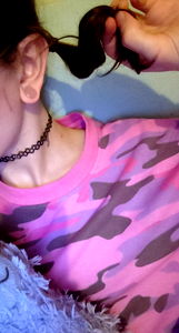 Model Kittie shares a playful moment with her bunny ears, posing in a cozy room with warm tones.