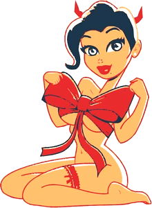 Stylized promotional artwork featuring a woman with devilish horns and red ribbon tied around her waist, presenting an unwrapped gift.
