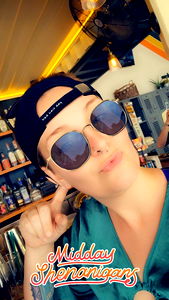 In a lively bar setting, BAMA girl exudes confidence with her sunglasses and blue baseball cap. She's making an inviting gesture with her index finger, ready to serve drinks to her patrons.