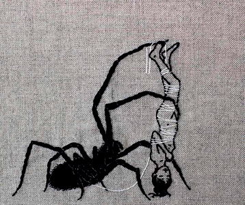 The image showcases a woman with dark hair, wearing a black outfit with a purple necklace. She has red makeup on her eyes and is holding up the peace sign with one hand while pointing with her other hand. The background is blurred but suggests an indoor setting. The model's attire and accessories hint at a style that may appeal to fans of alternative or gothic fashion.