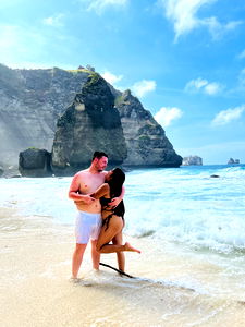 In the image, Lily and her partner are enjoying a romantic moment at the beach. They are standing close together, with the vast ocean in the background and rock formations adding to the picturesque setting. The couple is near the water's edge, where they seem to be dancing or embracing each other, capturing an intimate and joyful moment.