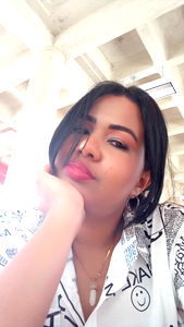She is wearing a black top and has long hair. The background is not visible but it seems to be an indoor setting. Onlyfans model Joselin Morillo.