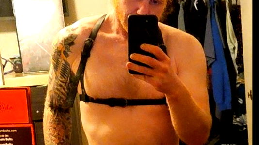 A photo of a muscular male model in a sports bra and straps, with tattoos. He is captured in a moment of relaxation or perhaps after a workout. The photo appears to be taken in his personal space.