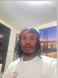 Kuro is a talented individual showcasing his unique style. In the image, he stands confidently in front of a vibrant mural, wearing a white t-shirt paired with an eye-catching blue bandana on his head.