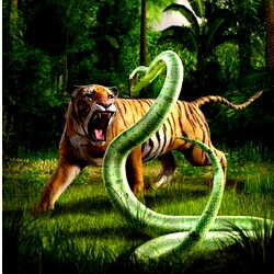 A dynamic, fantastical illustration showcasing a large python, a fierce tiger, and the lush greenery of a jungle. The python is coiled around the tiger, creating a dramatic scene that captures the viewer's attention. The colors are vibrant, with the green of the foliage contrasting against the snake's scales and the tiger's fur. This artwork would be perfect for a fantasy story or as a piece to add an element of adventure to any setting.