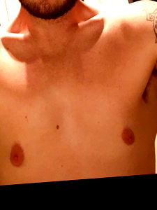 A shirtless photo of a man with visible tattoos. The background is neutral, and the focus seems to be on his upper body. He appears to have a relaxed posture.