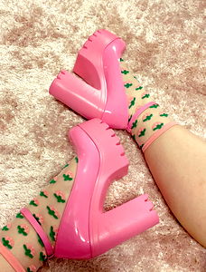 This image captures the fashion-forward style of BlissAmare, a model from Australia. She is seen wearing tall pink high heels, paired with socks featuring a cactus design. The shoes are chunky, adding an edgy touch to her outfit. Her choice of footwear and sock accessory reflects her bold and adventurous fashion sense.