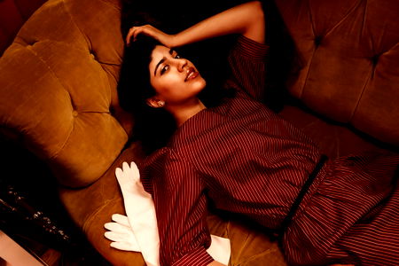 In this image, the Onlyfans model Blouberrii is captured in an editorial-style photoshoot. She is dressed in a chic ensemble and appears to be sitting on a couch with a thoughtful expression. The background is neutral, allowing her outfit to stand out.