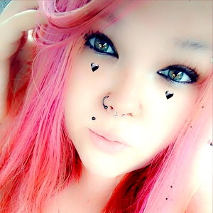 A woman with pink hair and blue eyes is seen in this photo. Her face is partially covered by a hand, which holds a pink heart as a gesture of love or friendship. The background is simple, allowing the subject to stand out prominently.