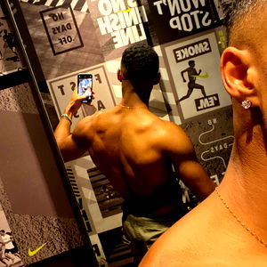 Mikey Tomman, a fitness model from Uruguay, presents his gym routine in a modern bathroom. The photo highlights the importance of maintaining a healthy lifestyle and staying fit.