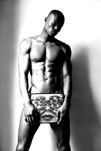 A muscular young adult male model striking a pose in black and white. He is shirtless, showing off his physique, with an intense gaze.