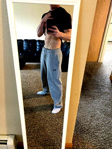 Brent Brewer, a fitness enthusiast and OnlyFans model, showcases his well-defined physique after an intense workout. He stands shirtless in front of the mirror, flexing his muscles, while holding his phone to capture this moment.