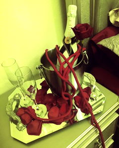 A luxurious and romantic setup featuring a champagne bottle, red roses, and a wine glass, ready for a celebration. A hint of sophistication is added with the silver bucket and its content.