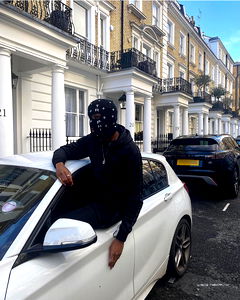 This image captures a moment of a model striking a pose on the roof of a car in what appears to be an urban setting. The model is dressed casually and seems to be enjoying themselves. They are looking directly at the camera, exuding confidence. In the background, there's a residential area with classic British houses, suggesting this photo might have been taken in London or another city that resembles it architecturally. It seems like a pleasant day with clear skies.