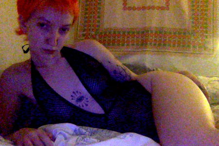This image features a model from the platform OnlyFans, with a visible tattoo and wearing a lingerie or swimsuit. The model has short hair, is wearing fishnet stockings, and poses in front of a wall with posters and a blue hue.