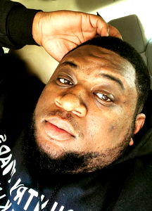 A man is lying down, looking up with a slight smile. He's wearing a black hoodie and a baseball cap. The background suggests he's inside a vehicle.