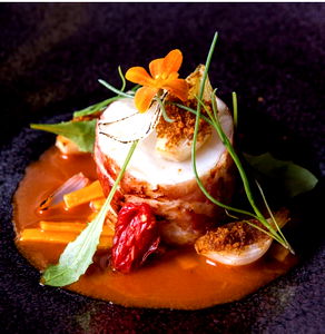 A tantalizing dish featuring a creamy lobster served with a medley of fresh vegetables and herbs, presented on a dark, textured surface with a sauce drizzled for added depth.