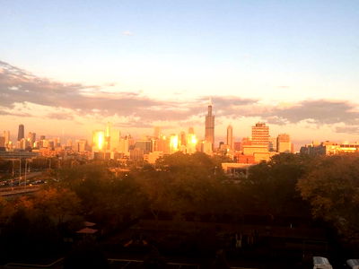 The image captures the iconic Chicago skyline at sunset, showcasing its architectural diversity and vibrant city life. From an elevated vantage point, the viewer can appreciate the impressive height of the buildings and their silhouettes against the sky. The warm colors of the setting sun cast a beautiful glow over the entire scene.