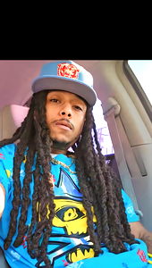 A rapper strikes a confident pose in front of a fence, holding up middle finger while wearing a baseball cap, denim jacket, and jeans. He is also wearing a necklace, bracelet, and chain around his waist. His hair is styled with dreadlocks.
