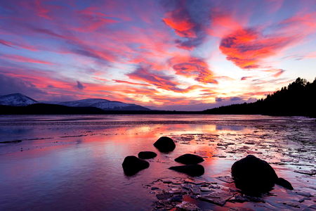 Coco captures the tranquility of a calm lake at sunset, with a vibrant sky reflecting off the water. The scene is peaceful and picturesque.