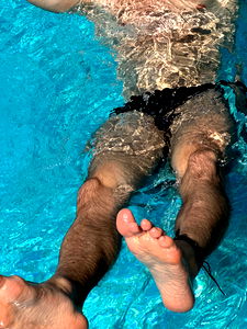 The image showcases a person in an underwater setting, with their legs crossed and feet pointing upwards. The photo appears to be part of a photoshoot or modeling project. It's difficult to determine the age from this angle, but it is an adult. The gender is not visible in the photo.