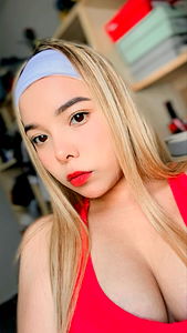 The image features a young woman with long hair wearing a red sports bra. She is looking directly at the camera, and there is a blurred background that appears to be an indoor setting. Her makeup includes defined eyebrows and lips, which give her a polished look.