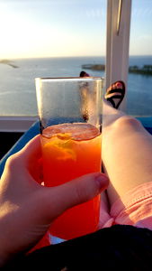 A tranquil moment as Cuck Queen Cali stands on the deck of a cruise ship, taking in the breathtaking ocean view with the sun setting over it.