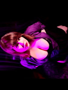 Professional model poses seductively for photoshoot. The model, Coralee, is wearing a purple corset and stockings, with dark hair styled elegantly. She has fair skin and blue eyes. Coralee is kneeling on a velvet surface with her hands delicately on the floor behind her.