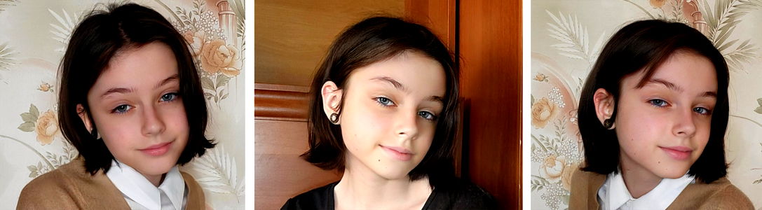 A young girl with short hair and striking blue eyes poses confidently for the camera.